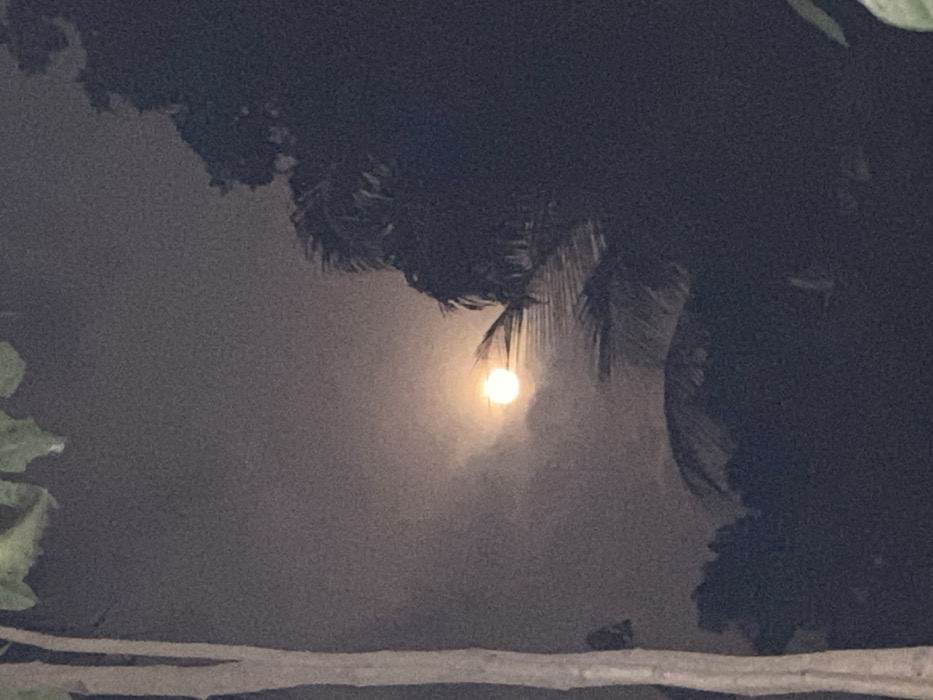 This image captures a nocturnal scene in the city of Nguzu Edda, Nigeria. A bright, spherical luminous object, consistent with the moon, is centrally positioned against a dark, cloudy sky, partially veiled by diffuse cloud formations. Silhouetted vegetation frames the scene: a vertical, light-toned tree trunk with minimal visible foliage occupies the left edge, while dark, dense foliage, including discernible palm fronds, is prominent on the right and extends across the lower portion of the frame. The overall environment is characterized by low light, with no discernable human figures, activities, or distinct man-made structures.