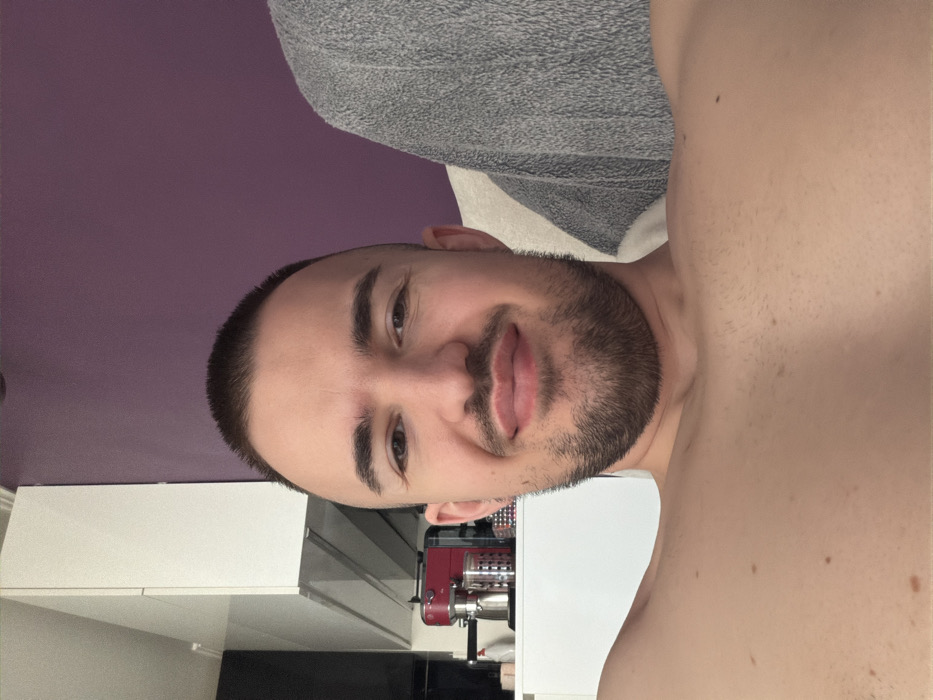 The image displays a male individual in a close-up selfie within an indoor domestic setting located in Sofia, Bulgaria. The subject is a male, estimated to be between 25 and 35 years old, featuring short, dark, buzz-cut hair and a trimmed dark beard. He is shirtless, exposing his upper chest and shoulders, which exhibit scattered small moles. His facial expression includes a slight smile with lips faintly parted. He maintains direct eye contact with the camera. The background on the left side of the frame shows a kitchen area with white overhead cabinets, a silver range hood, a red espresso machine, a metallic pitcher, a transparent jar, and a white bottle on a countertop. The background on the right side consists of a plain purple wall, against which a grey, textured textile, possibly a blanket or towel, is draped over an unseen object.