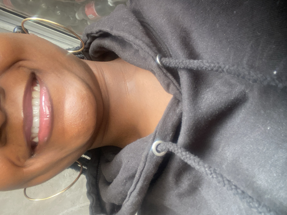 The image presents a close-up view of an individual, from the upper chest to just above the eyes, located in Sabon Gari West, Nigeria. The subject has dark skin and is smiling, revealing white teeth and glossy lips with a reddish tint. Two large, thin, gold-colored hoop earrings are visible, one on each ear. The individual wears a black hooded sweatshirt with a visible drawstring passing through two silver-colored metal eyelets at the collar. The background is out of focus; on the left, a light-colored surface is visible, and on the right, several dark-colored plastic bottles are stacked.