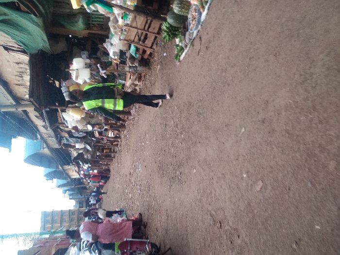 A street market scene shows stalls under awnings lined with goods. People mill around the market, and a person wearing a bright yellow vest walks along the dirt path. The buildings are on the left side of the frame, and a variety of products can be seen for sale. The lighting is soft and diffused, and the atmosphere feels bustling and informal.