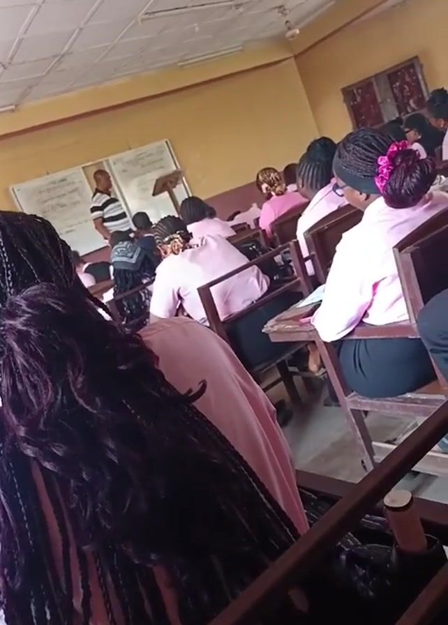 classroom setting where a male instructor is teaching a class to a group of students, all of whom appear to be female. The instructor is standing at the front of the classroom near a whiteboard that is covered with writing. He is wearing a horizontally striped shirt and addressing the students. The students are sitting at individual desks, arranged in rows. Most of them are wearing pink shirts, which suggests a uniform. The camera is positioned behind the students, offering a view of the back of their heads and the general classroom layout. The classroom has yellow walls and a white ceiling with a ceiling fan. The furniture appears to be made of wood and metal. Another male is standing on the side observing the class.