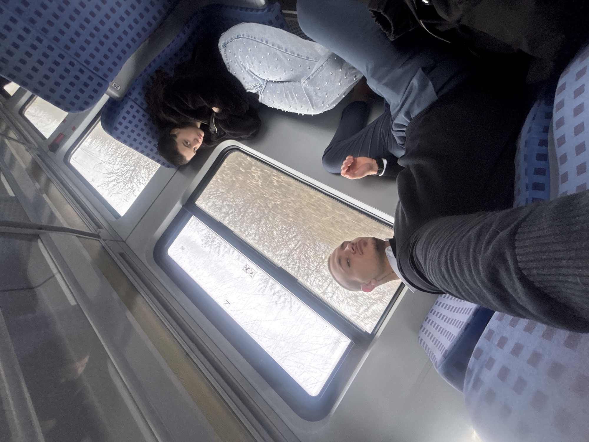 two people sitting across from each other on a train. A woman with long dark hair is sitting on one side, wearing light-colored jeans with embellishments and a black jacket. On the other side, a man is sitting with his back to the camera, wearing a dark sweater. A window is between them, and a winter scene is visible outside, suggesting trees without leaves. The train interior shows patterned blue seats. The location appears to be a train, but the exact location cannot be confirmed from the image. It's highly improbable the exact location is in Novi han, Bulgaria, considering the environment visible through the window.