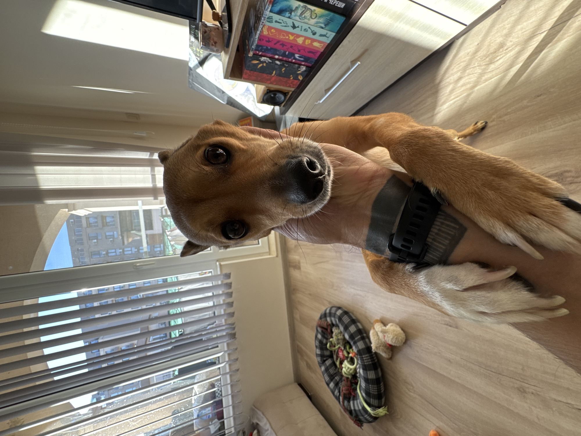 A close-up, slightly distorted image shows a brown dog with its head pressed against a person's forearm. The person's forearm is adorned with a dark wrist-worn device and a partial tattoo. The dog's paws rest on the forearm near the wrist. The background includes a window with closed blinds, revealing a cityscape with apartment buildings, characteristic of an urban setting. Additional elements include a dog bed with toys nearby and a light-colored wooden floor. Part of a shelf with stacked books is visible above the dog's head. While the architectural details of the buildings through the window suggest an Eastern European urban environment, specific Plovdiv landmarks are not visible, preventing precise location identification within Plovdiv. The light suggests a sunny day.