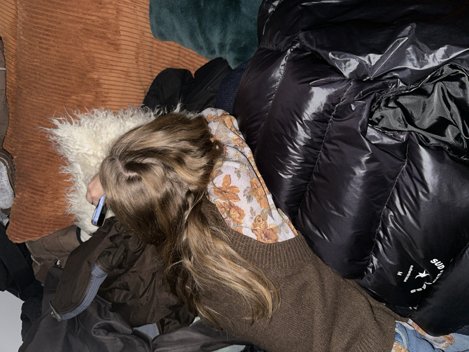 A woman with long, light brown hair lies on a pile of clothing. She holds a phone to her ear, resting her head on a white, furry pillow. She is wearing a brown sweater vest over a floral-patterned shirt. A large, black puffer jacket is beside her. The clothing pile includes various shades of brown and black jackets and coats. The background features a brown corduroy surface and a patch of green.