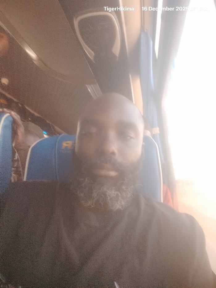 A bearded Black man is seated on a bus. The man has a shaved head, a dark complexion, and a salt-and-pepper beard. He is wearing a dark-colored, crew-neck t-shirt. The bus seat has a blue and white pattern. There is bright light outside the bus window. The picture appears to have been taken on December 16, 2025, and includes the username "TigerHikima" in the top left corner.