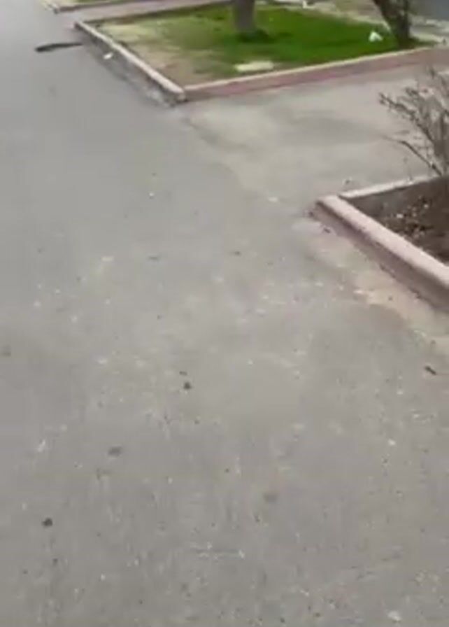 view from a person walking down a paved road in an urban setting. The road is lined with multi-story buildings that appear to be apartment complexes or residential structures. Several cars are parked along the side of the road. There are patches of greenery, including grass and trees, interspersed between the buildings and the road. A small playground is visible behind a green and blue fence. The sky is overcast, and the lighting suggests it's daytime but not particularly sunny. The camera shakes slightly, indicating the person is walking or moving. The scene is quiet and ordinary, depicting a common residential area.