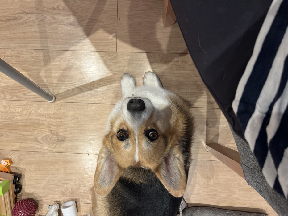 - "A tri-color Pembroke Welsh Corgi, exhibiting fawn, white, and black markings, is positioned on a light-colored wooden floor" by FM-4GKkh1, licensed under CC BY 4.0