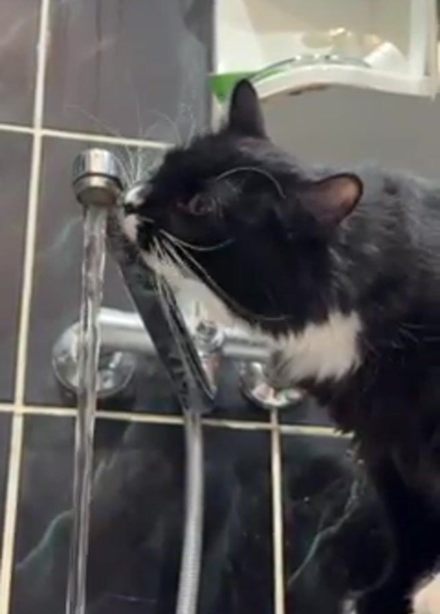 - "A black-and-white cat stands on a bathroom counter, lapping water directly from a running faucet" by FM-LoC4w2, licensed under CC BY 4.0