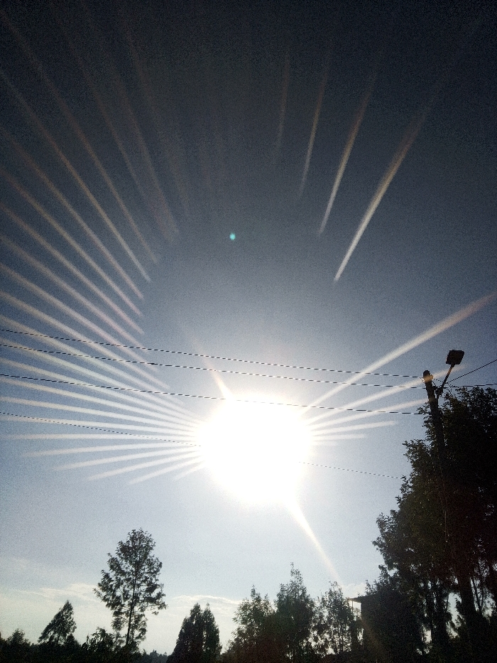 The image presents an outdoor scene captured in Nachu ward, Kenya, under bright, direct sunlight. The dominant feature is the sun, positioned centrally, exhibiting intense glare and prominent sunburst effects that radiate across the sky. The sky transitions from a lighter blue at the horizon to a darker shade overhead, featuring a distinct green-blue lens flare in the upper left quadrant. Multiple dark, thin utility lines are visible stretched horizontally across the mid-ground, slightly above the sun's apparent position. Along the bottom of the frame, a dense canopy of dark green trees and foliage is silhouetted against the bright background. On the far right, a dark utility pole with an attached street light fixture extends upwards from behind the tree line. No individuals, animals, or discernible actions are present within the frame.
