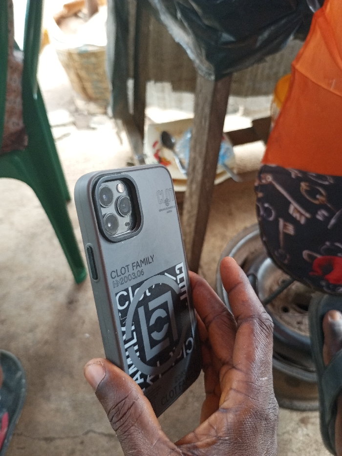 A dark-skinned individual's hand, exhibiting fine wrinkles, firmly grasps a dark grey smartphone case for a device with a triple camera array. The case is adorned with white text reading "CLOT FAMILY" and ">>>2003.06", along with a prominent "CLOT" logo and additional "CLOT" branding in a repeating pattern. The scene is set in Orie Uratta, Nigeria. In the immediate background to the left, a portion of a green plastic chair is visible, positioned on what appears to be an unpaved or dirt ground surface. To the right, an orange garment hangs or rests, partially obscuring a darker object. Below this, a foot wearing a dark sandal is present, positioned near a metallic object resembling a wheel rim or container. A wooden structural beam extends vertically, with a black plastic bag draped over its top. Further in the background, a white plastic plate containing a spoon is visible, suggesting a casual outdoor or semi-enclosed environment, possibly a market or a local stall.