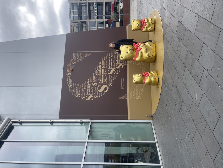 The image displays the exterior of the Lindt Chocolate Museum (Schokoladenmuseum) at Rheinauhafen, Cologne, Germany. A fair-skinned female subject stands on a paved plaza, positioned to the right of three golden teddy bear statues. She is wearing glasses, a black winter coat, and dark trousers, facing towards the viewer. The three statues are arranged on a circular gold-colored platform. The central teddy bear is the largest, featuring a red bow with a heart-shaped pendant displaying "Lindt L'OR". Two smaller, identical golden teddy bears flank the central figure, each adorned with a red bow and holding a red heart. The museum's facade, visible behind the statues, features a light gray upper section transitioning to a two-tone brown and gold lower section. The brown section is decorated with a heart-shaped text design composed of repeated "Schokoladen Museum" and "Lindt" branding, including an "S" logo. An orange, circular fixture is mounted on this brown facade section. To the far left, a multi-pane glass facade reflects a street scene and a bicycle. In the background on the right, another modern, multi-story building with numerous windows is visible, displaying "SIGNAL IDUNA" and "MOBILAB" signage. The ground consists of dark gray rectangular stone pavers. The sky is overcast.