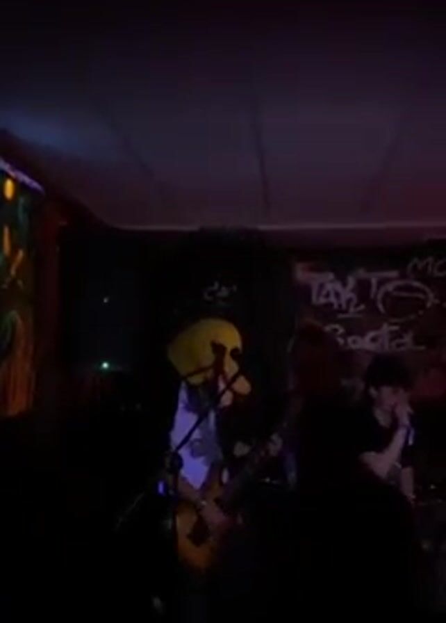 The scene unfolds within a dimly lit space, giving the impression of a live music venue. A guitarist is positioned on the stage, wearing a yellow rubber duck mask. He is playing a brown electric guitar and wearing a white t-shirt with a colorful design. The scene is partially obscured by the darkness, but a microphone stands in front of him. To his right stands a person singing into a microphone, dressed in a black shirt. Behind the two performers is a dark wall adorned with graffiti, including the word "Tanto." The area surrounding the stage is generally dark. A small section of wall to the left of the stage is decorated with vibrant green and orange glow-in-the-dark paint.
