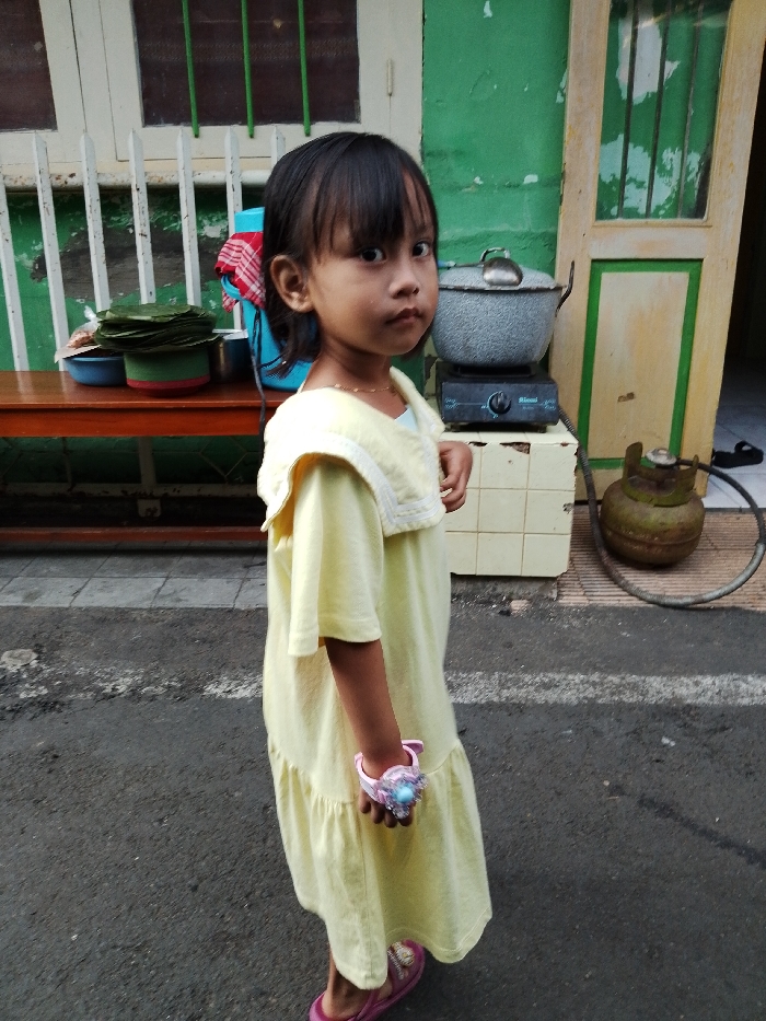 A young girl with dark hair and bangs wears a yellow dress and pink sandals. She has a pink toy on her wrist. She stands on an asphalt surface. Behind her is a green building with white trim, a wooden table with food, a cooking stove, a pot, and a gas tank. The lighting appears to be overcast.
