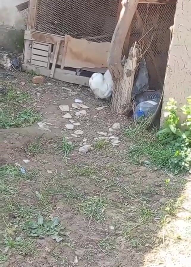 small, cluttered outdoor space. A white chicken sits near a wooden structure with a wire mesh front, possibly a coop. To the right, a thin tree trunk stands, with a plastic bag and a blue water bottle leaning against it. The ground is a mix of dirt, grass, and small stones. There are some miscellaneous items scattered around, including what looks like a wooden pallet near the coop. The camera moves slightly throughout the video.