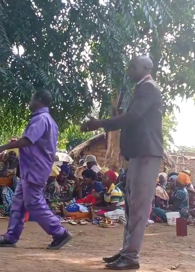 Two men stand in a dirt clearing, speaking to a seated group of people. The man on the left wears a purple jumpsuit and black shoes. He is clapping his hands. The man on the right wears a dark gray suit jacket, light gray pants, and black shoes. He is holding a microphone and appears to be speaking. The group of people sitting on the ground behind them are mostly women, many wearing colorful patterned clothing and head coverings. Several plastic buckets are scattered around the seated group. Behind the group are simple structures and trees. Another man wearing a red jacket and tan pants walks across the clearing, holding a phone. The scene is outdoors, possibly in a village or rural area.