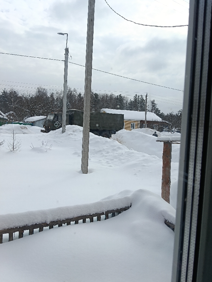 The image displays an outdoor winter scene in Krasny Mayak, Russia, under an overcast sky. In the immediate foreground, a wooden railing is visible on the left, heavily covered in snow, with a window frame on the far right indicating the vantage point. The ground throughout the visible area is covered in deep, undisturbed snow, forming mounds and drifts. Two grey concrete utility poles stand centrally in the midground; the left pole has a street light attached. Overhead power lines traverse the scene. Parked behind the utility poles is a dark green military-style truck, likely a KAMAZ or Ural, with a distinctive white "Z" symbol painted on its front cabin. The truck's cargo bed is partially obscured by snowdrifts and a canvas cover. Beyond the truck, several single-story residential buildings, their roofs blanketed in snow, are visible. One prominent house on the mid-right features light brown siding and white-framed windows. A dark-clad individual is partially visible behind a snowdrift near this house, appearing to be stooping or standing. The background features a dense line of snow-dusted deciduous and coniferous trees, forming a forest edge.