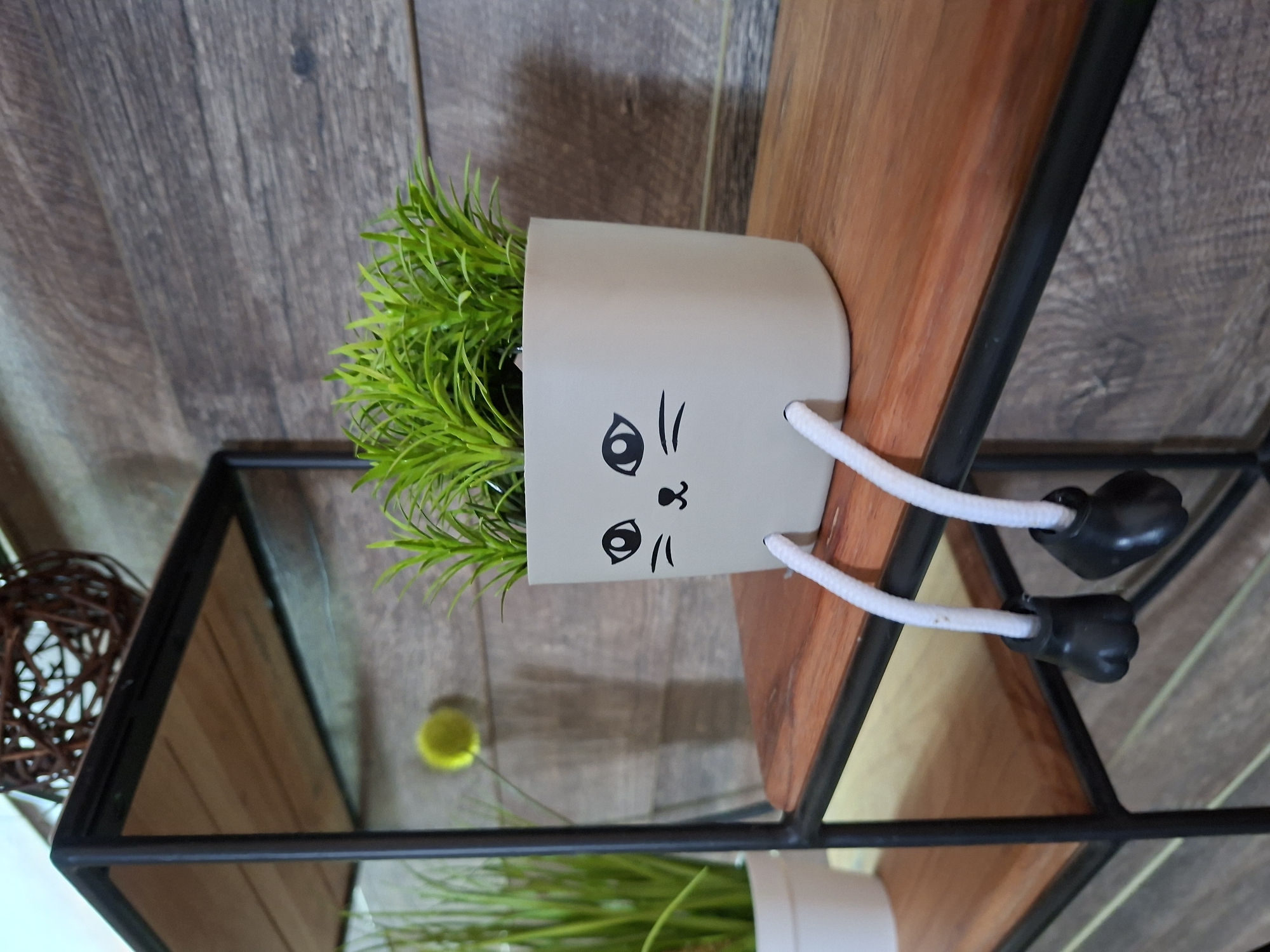 A close-up shot presents a cat-themed planter with artificial green plants, positioned on a wooden shelf with a black metal frame