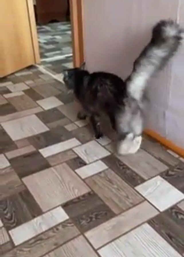 A cat is rubbing its back against a wall near a doorway. The cat is gray and white with long fur and a bushy tail. It is walking on a tiled floor that resembles wood planks. The walls are painted white, and the door is wooden and light-colored.