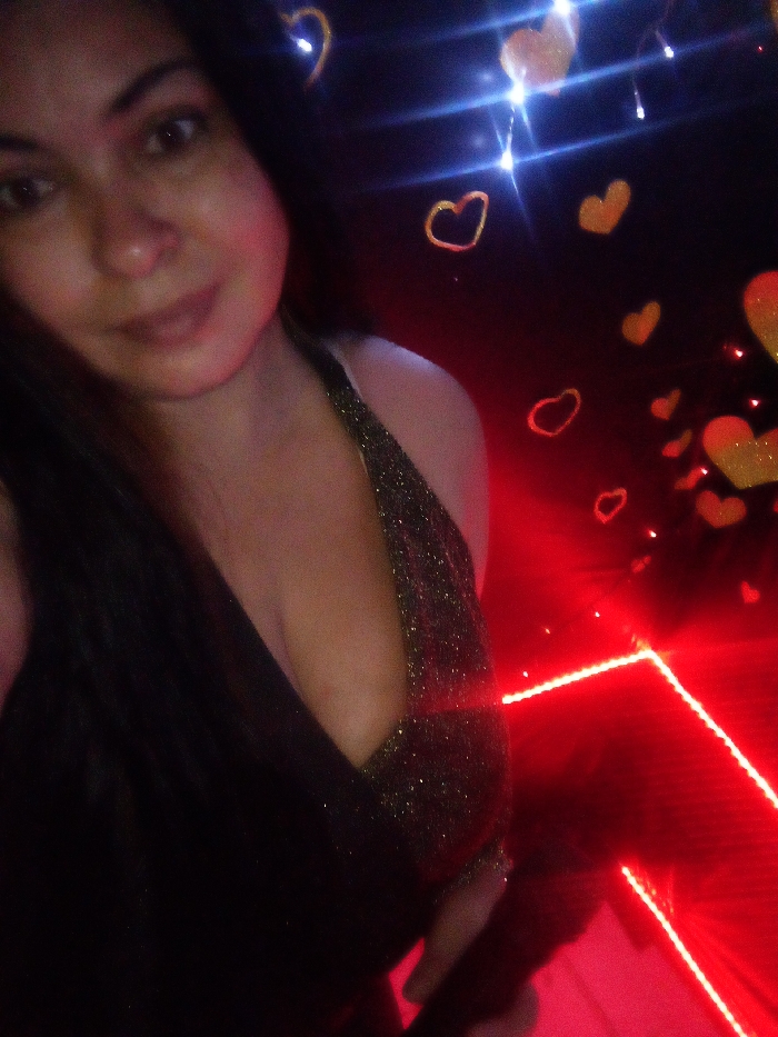 A single individual, identified as female, is positioned centrally and to the left of the frame, visible from the chest upwards. She has long, dark hair and is looking directly towards the camera with a subtle expression. She wears a dark garment with a V-neckline; the fabric visible on the chest appears to be a shimmering or glittery dark green/gold. The scene is an indoor entertainment venue, presumed to be in Juan Griego, Venezuela. The background is predominantly dark, illuminated by various light sources and decorative elements. Numerous heart-shaped objects or projections, some yellow/gold and solid, others outlined in orange/red light, are scattered across the background. Several bright blue-white light sources in the upper background produce lens flare effects. The lower right quadrant of the image is strongly illuminated by a red light, possibly an LED strip or laser, forming bright red lines and casting a reddish hue on the subject's right side. The overall lighting and decor suggest a festive, dim environment such as a nightclub or bar.