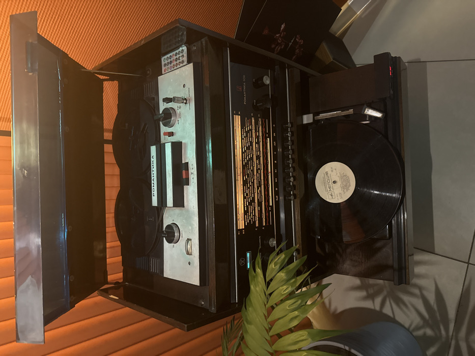 The image depicts an indoor scene, likely a residential room in Lida, Belarus. The primary subject is a vintage, dark brown multi-component audio console, possibly a radiogram. The console features three main sections: 1. **Top Section:** An open lid reveals a silver-faced reel-to-reel tape recorder. Two dark tape reels are mounted on the deck, which is labeled "РОМАНТИКА" (Romantika). Several control knobs and buttons are visible on its surface. To the right, a dark remote control unit with multiple buttons is positioned. 2. **Middle Section:** A silver-faced radio tuner or receiver unit is integrated below the reel-to-reel. It displays an illuminated frequency dial with markings for various bands (MB, KB, D, C) and is labeled "РОМАНТИКА 104" (Romantika 104). Below the dial, a row of smaller buttons and several control knobs are present. A faint blue light is visible on the far left of this section. 3. **Bottom Section:** An integrated record player is situated at the base of the console. A black vinyl record with a white "МЕЛОДИЯ" (Melodiya) label is placed on the turntable. A tone arm is visible to the right of the record. The background consists of an orange, vertically ribbed surface, likely window blinds or a textured wall covering. In the lower-left foreground, a green leafy houseplant in a light-colored pot is visible, casting shadows onto the light-colored tiled floor. No individuals are present, and no active operations are depicted on the audio equipment.