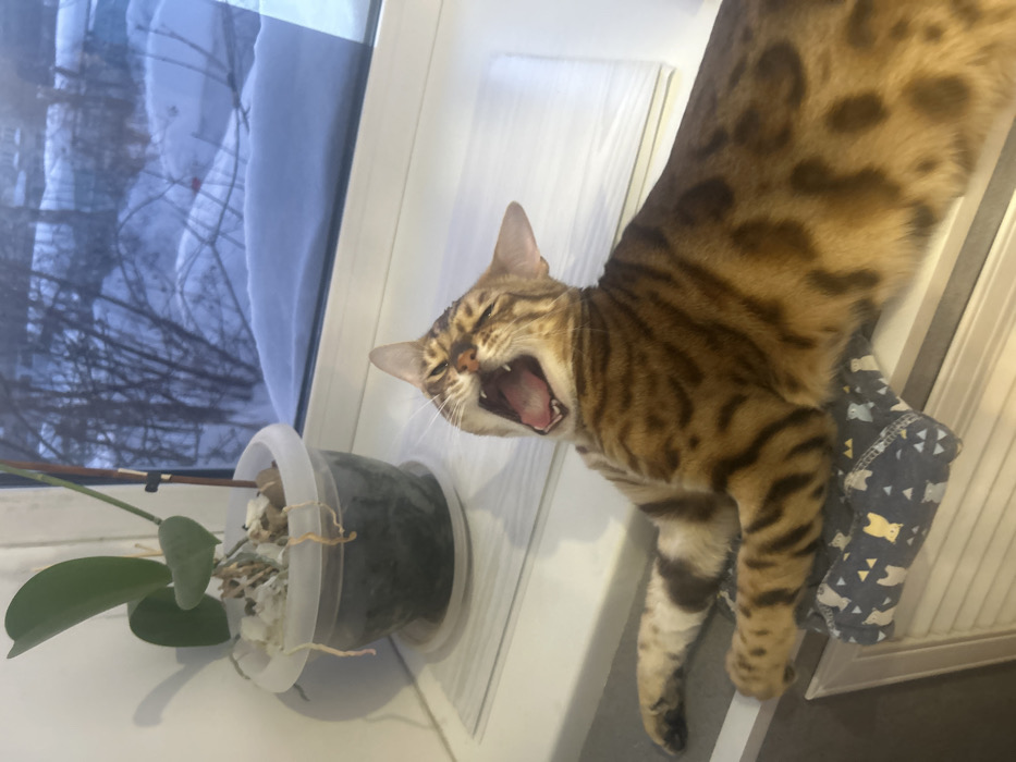 - "A Bengal cat with distinctive brown and black leopard-like markings lies stretched out on a white windowsill indoors, positioned in Chusovoy, Russia" by FM-Fc82p1, licensed under CC BY 4.0