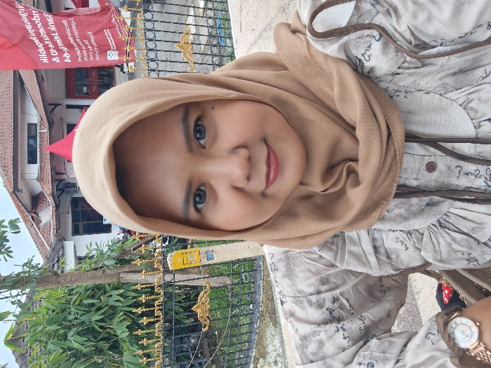 A young woman wearing a tan hijab smiles at the camera. She is wearing a patterned blouse with brown trim. A watch is visible on her wrist. Behind her, there is a wrought iron fence, green foliage, and a building with a red banner. The picture appears to be taken outdoors, possibly in front of a building. The scene is bright and clear.