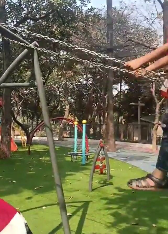 A young boy, clad in a red shirt and patterned pants, is seen on a swing in a park setting