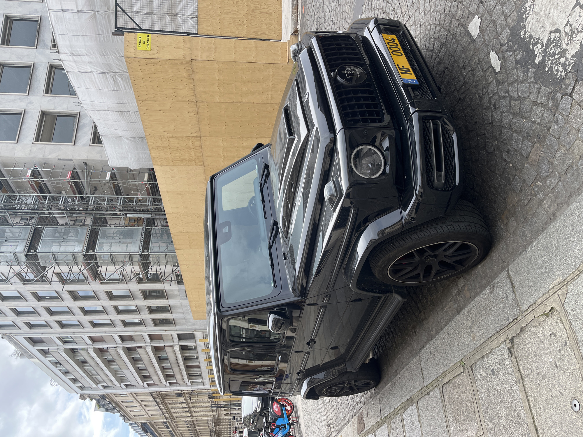 The image captures a black Brabus G-Wagon parked on a cobblestone street. The license plate reads "NF 0004". Adjacent to the vehicle is a building undergoing construction, featuring scaffolding and a sign that reads "Entrée de Chantier" ("Construction Site Entrance"). The overall setting appears to be a street in Paris, France. There are no people visible in the image, but there are several bicycles parked in the background. The environment is urban, and the time of day appears to be daytime.