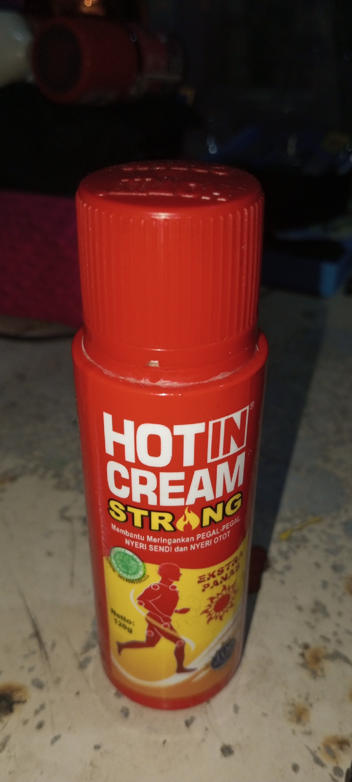 red bottle of "HOT IN CREAM STRONG" pain relief cream. The label mentions it helps alleviate muscle aches, joint pain, and muscle pain. It also indicates the cream has an extra warming effect. A graphic on the bottle depicts a person running with highlighted joint areas. The net weight of the cream is 120g. There's also a green halal symbol on the bottle.
