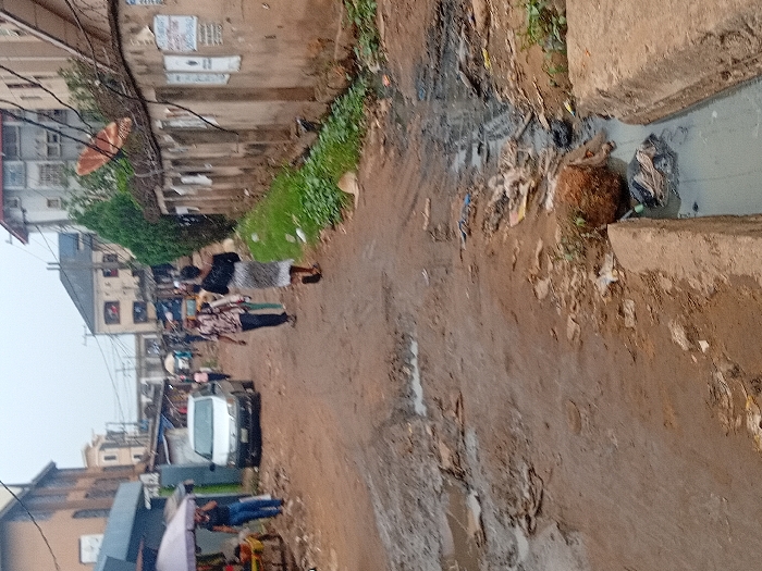 A muddy, unpaved street scene in what appears to be a densely populated urban area