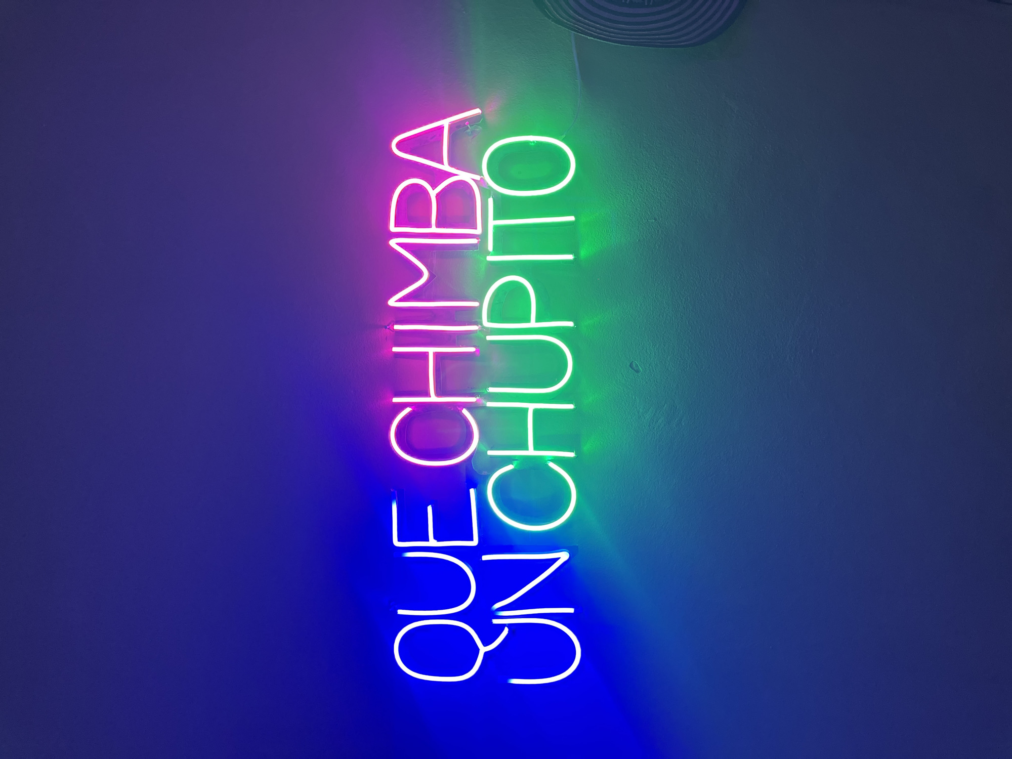 A vertically oriented, indoor, eye-level shot depicts a colorful neon sign on a wall. The neon sign reads "QUE CHIMBA QUE NO CHUPITO" in stacked, vertically oriented lines. The word "QUE" is in white neon with a blue hue from lighting. "CHIMBA" is in pink neon with a purple hue from lighting. "QUE NO" is in white neon with a blue hue from lighting. "CHUPITO" is in green neon. The wall is light blue and smooth. There is a small portion of what appears to be a white object at the very top of the frame.