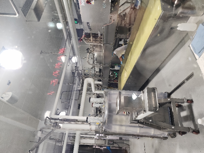 This image depicts an operational dairy or cheese production facility, specifically identified by a red LED sign displaying "BEECHER'S HANDMADE CHEESE," located in Seattle, Washington. The scene features a long, rectangular, stainless steel vat occupying the mid-ground, filled with a substantial quantity of a light yellow, semi-solid material, consistent with cheese curds or a similar dairy product. One individual is visible in the mid-right, wearing a white smock and blue gloves, leaning over the vat, engaged in processing the contents. To the left, a mobile stainless steel unit with a square top, possibly a hopper or pressing device, rests on red-wheeled casters. The facility is equipped with extensive stainless steel piping systems, tanks, and industrial machinery, some branded "BEECH," indicating the equipment manufacturer. The floor is light gray and appears clean. Bright overhead industrial lighting illuminates the entire area. In the immediate foreground, a white plastic squeeze bottle and a folded blue cloth are visible on the floor.
