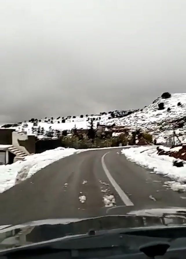 The view from inside a car traveling on a paved road winding through a landscape dusted with snow. The road has a white line marking its center. To the sides of the road, snow accumulates, particularly on the lower slopes of hills that rise in the background. Buildings are visible amidst the snowy landscape on the left. The sky is overcast, adding to the wintry feel.