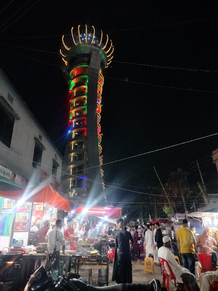 street food market in Charfasson Sadar, Bangladesh, at night, illuminated by streetlights. A tall, multi-story tower with brightly colored lights is visible in the background. There are numerous food stalls, some with red awnings, where people are cooking and selling food. Some people are shopping and eating, while others are sitting and talking. Several motorcycles are parked in the street. The scene is vibrant and bustling with activity, with people interacting in a friendly atmosphere.