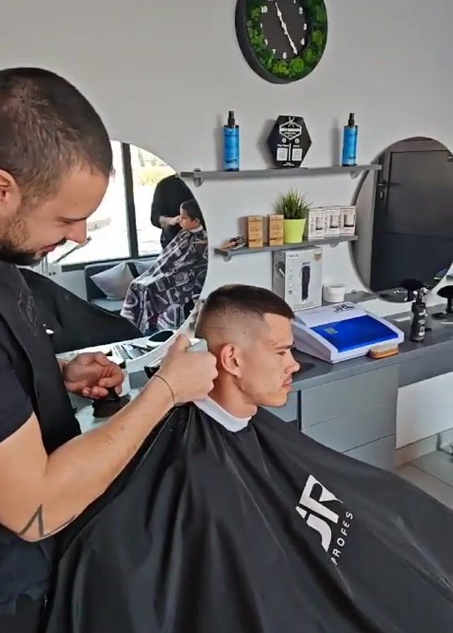 A barber is giving a haircut to a customer in a barber shop. The barber, a man with a beard, is wearing a black shirt and a black vest. He is using a hair clipper to trim the customer's hair. The customer is sitting in a barber chair and is wearing a black cape. The barber shop has a mirror, shelves with various hair products, a clock, and a certificate on the wall. Another person is sitting in a chair in the mirror's reflection.