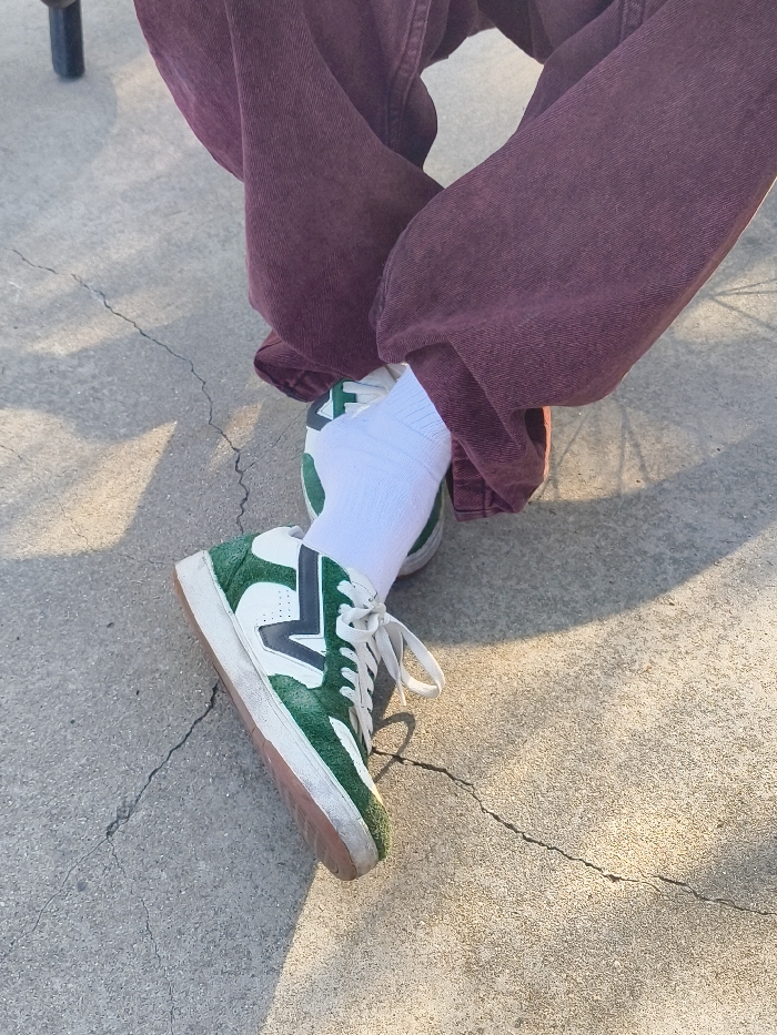 The image captures the lower body of an individual, specifically their legs and feet, viewed from an elevated perspective. The person is wearing loose-fitting, baggy trousers in a dark reddish-brown color, possibly maroon or burgundy, over white crew-length socks. On their feet are high-top sneakers, predominantly green with white accents. A distinct white "V" shaped stripe is visible on the lateral side of the visible shoe, complemented by white laces. The sneakers have white rubber sidewalls and a brown/gum-colored outsole, showing signs of wear and scuffing. The individual's legs are bent, indicating a seated or crouched posture, with one foot positioned more prominently in the foreground and angled slightly inward. The ground surface is light gray concrete, characterized by multiple cracks and irregular textures. Strong, direct sunlight casts defined shadows across the concrete from the upper-left side of the frame. A dark, vertical object, possibly a metal pole or chair leg, is partially visible in the upper-left background. No specific geographical identifiers for Sofia, Bulgaria, are discernible within the image; the scene appears to be a generic outdoor paved area.