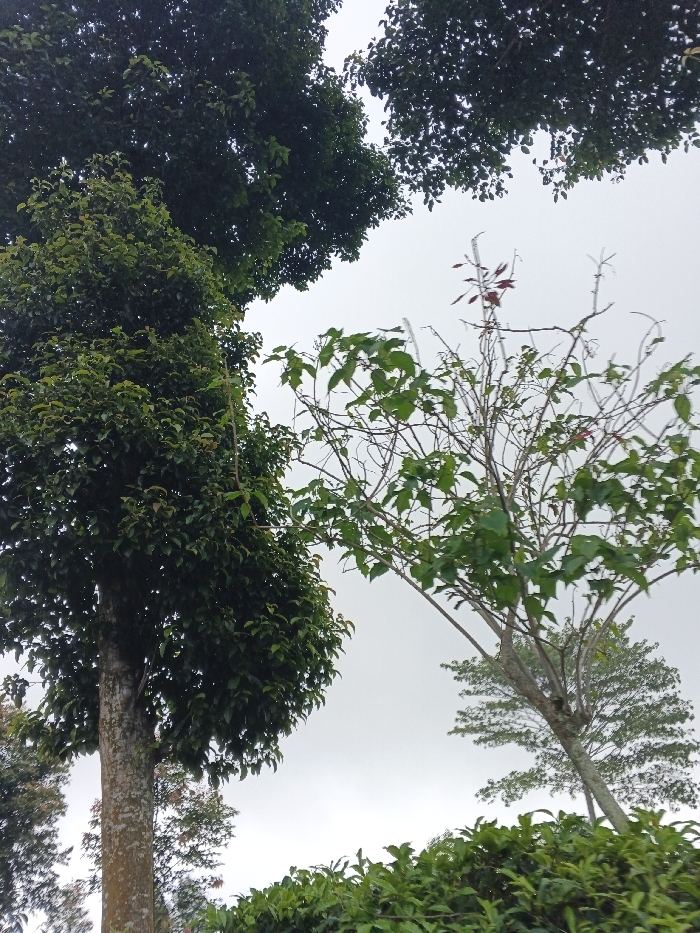 The scene, set in Pinnwe, Myanmar (Burma), depicts an outdoor natural environment under a uniform light grey, overcast sky. In the foreground-left, a large tree with a textured, light brown and grey trunk stands vertically, exhibiting dense, dark green foliage that extends beyond the upper-left frame. To its right, a second tree with a lighter, smoother bark leans toward the right, displaying a less dense canopy of lighter green leaves; some upper foliage appears reddish-brown, and multiple bare branches are visible. Along the bottom edge of the image, a dense, uniform layer of low-lying green foliage or bushes is present. Faint outlines of additional trees are visible in the distant background on the right side. No people, animals, man-made structures, or specific actions are observed within the frame.