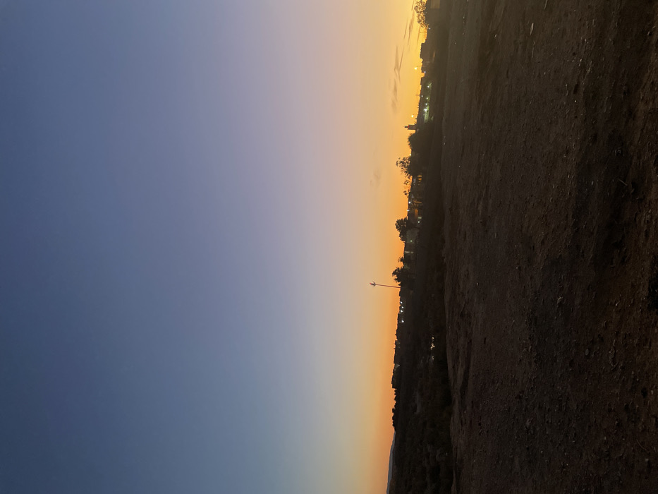 A landscape photo bisected by the horizon. To the left, a gradient sky fades from deep blue to a soft orange near the horizon. The right side is predominantly dark, depicting rough, earthy ground. A silhouette of trees, buildings, and a solitary light pole punctuate the horizon line. The lighting suggests a sunrise or sunset, with the sky displaying a warm hue.