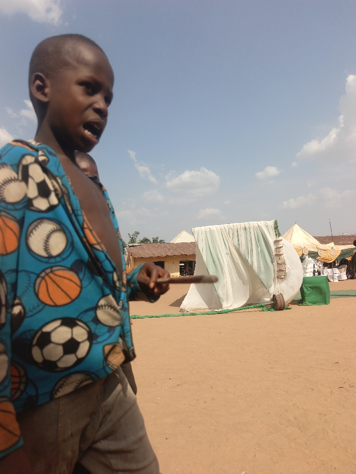 The image displays an outdoor scene in Akwanga, Nigeria, under a bright blue sky with scattered white clouds