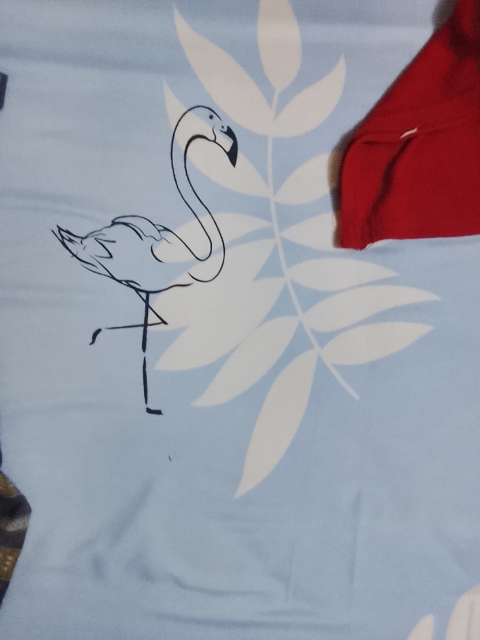 A light blue fabric backdrop displays a large white leaf pattern. A stylized drawing of a flamingo is centered left, with its head curved gracefully. To the right, a crumpled red fabric obscures part of the leaf design. The focus is clearly on the flamingo and leaf pattern on the fabric.