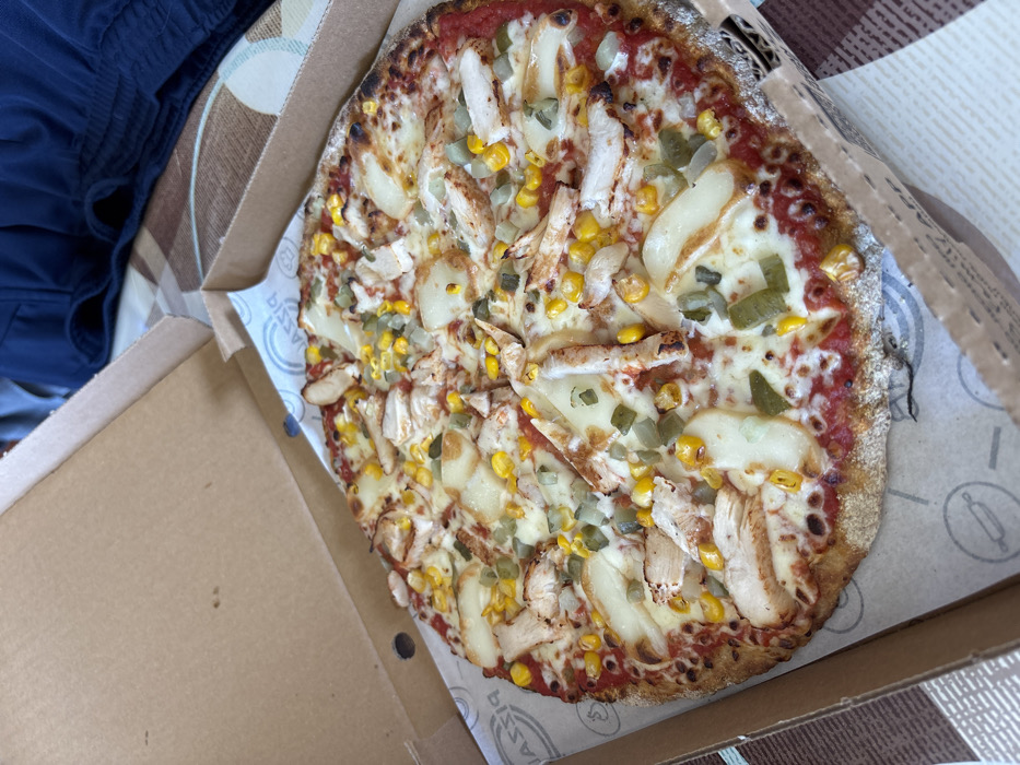 A whole, round pizza is presented within an open, light brown cardboard pizza box. The pizza features a tomato sauce base, a layer of melted white cheese, strips of cooked chicken, scattered yellow corn kernels, and cubed light green elements, likely pickled cucumbers or peppers. The crust is well-baked with visible charring at the edges. The interior of the pizza box lid is plain brown, while the base contains a white paper liner printed with repeated grey circular logos, one of which displays "PIZZA". The pizza box rests on a surface, partially obscuring a patterned brown and off-white checkered textile in the background. Dark blue fabric, consistent with casual apparel, is visible in the upper right background. The scene is situated in Tsaratsovo, Bulgaria.