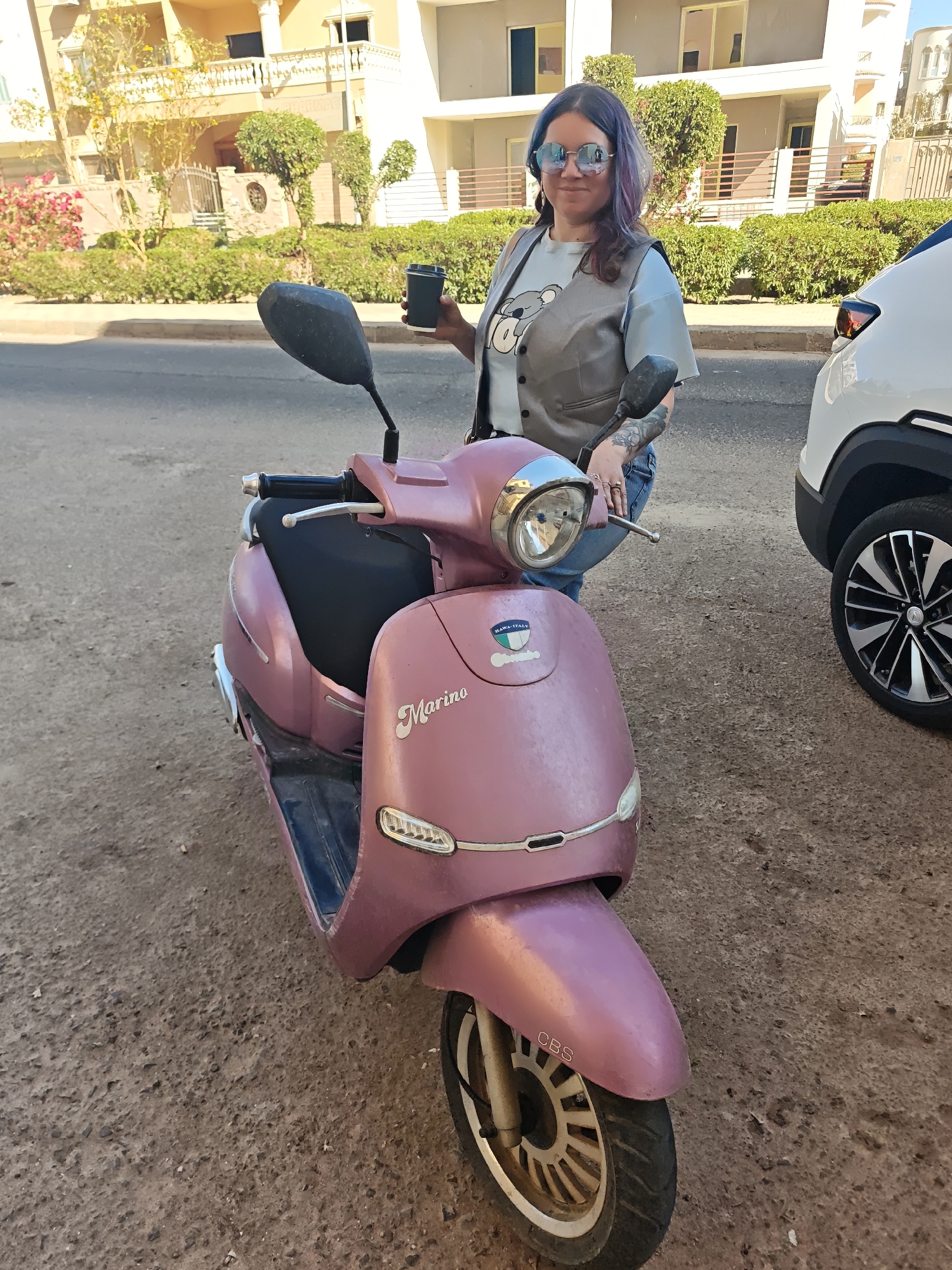 A woman stands next to a pink "Marino" scooter on a paved surface in Al Ahia', Egypt. She is positioned to the right of the scooter, leaning slightly with her left hand resting on its handlebar. She holds a dark-colored disposable cup in her right hand. The woman has dark hair with purple streaks, wears mirrored circular sunglasses, a light blue t-shirt with a koala graphic, and a grey vest. Tattoos are visible on her left forearm. The scooter, primarily pink with some silver and black accents, has a prominent "Marino" emblem on its front panel and a "HAWA-ITALY" logo on the handlebar cowling. Its front wheel has a multi-spoke design with "CBS" visible on the fender. To the woman's right, the front passenger side wheel and fender of a white SUV with black and silver multi-spoke rims are partially visible. The background features a street with a curb and a landscaped strip containing green bushes and some flowering plants (pink bougainvillea and yellow-flowered trees). Behind the vegetation are several multi-story residential buildings with balconies, light-colored facades, and windows, characteristic of modern Egyptian architecture. The sky is clear, suggesting daytime. The ground beneath the scooter and vehicles is a rough, dark grey-brown asphalt or concrete.