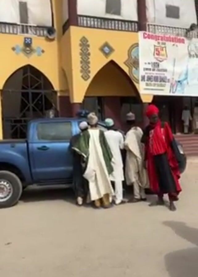 group of men gathered around the side of a blue pickup truck parked in front of a yellow and brown building. The men are wearing traditional clothing, including robes and hats. One man stands out in a bright red robe and turban. A banner hanging on the building reads "Congratulations on the 5th Year". The environment appears to be a public space in a warm climate. There is light traffic and a few people visible in the background. The men are interacting and seem to be engaged in conversation.