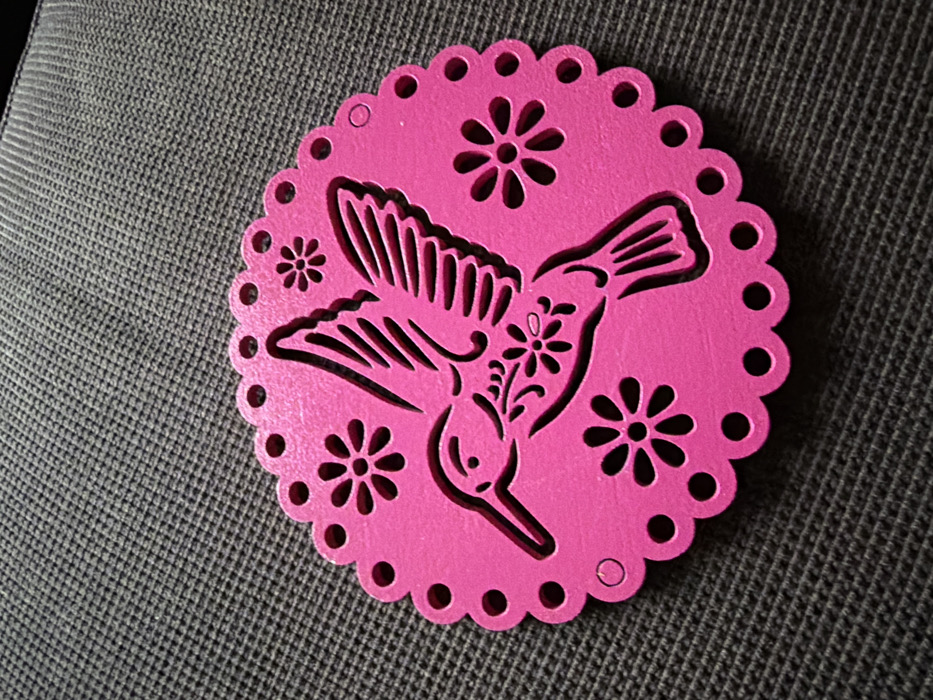 A circular, bright pink (fuchsia) decorative object, approximately 15-20 cm in diameter, is depicted resting on a dark gray, finely woven textile surface. The object's perimeter is scalloped, featuring 33 uniformly spaced circular perforations. Centrally, a stylized hummingbird in flight is carved out, oriented to the left with an extended beak, and its body is detailed with internal floral cutouts. Four additional floral cutouts are symmetrically positioned around the central hummingbird motif. The object displays a consistent thickness, casting subtle shadows under incident light originating from the upper-left. No individuals, actions, or specific environmental indicators are present to determine a precise location within the city of Huixquilucan de Degollado, Mexico; the scene depicts a generic indoor surface.