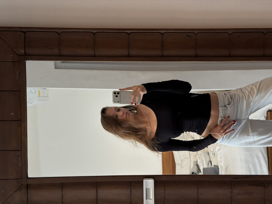A female subject is depicted in a mirror selfie taken within a room located in Tibubeneng, Indonesia. She stands in front of a large mirror featuring a thick, dark brown wooden frame with carved details. The female has long, wavy brown hair and wears a black long-sleeved, scoop-neck top, exposing a portion of her midriff, paired with light-wash jeans. Her left hand, with red polished fingernails, holds a light-colored smartphone pointed towards her, while her right hand, also with red polished nails and a beaded bracelet, rests on her upper thigh. A faint tattoo is visible on her left upper chest. The reflection behind her reveals a bedroom environment with white walls, a bed made with white linens, a wooden headboard, and some dark clothing items resting on the bed. A white rectangular fixture, possibly an air conditioning unit or control panel, is mounted on the wall in the upper left corner of the reflection. A silver horizontal light or switch is visible on the left side of the mirror frame.