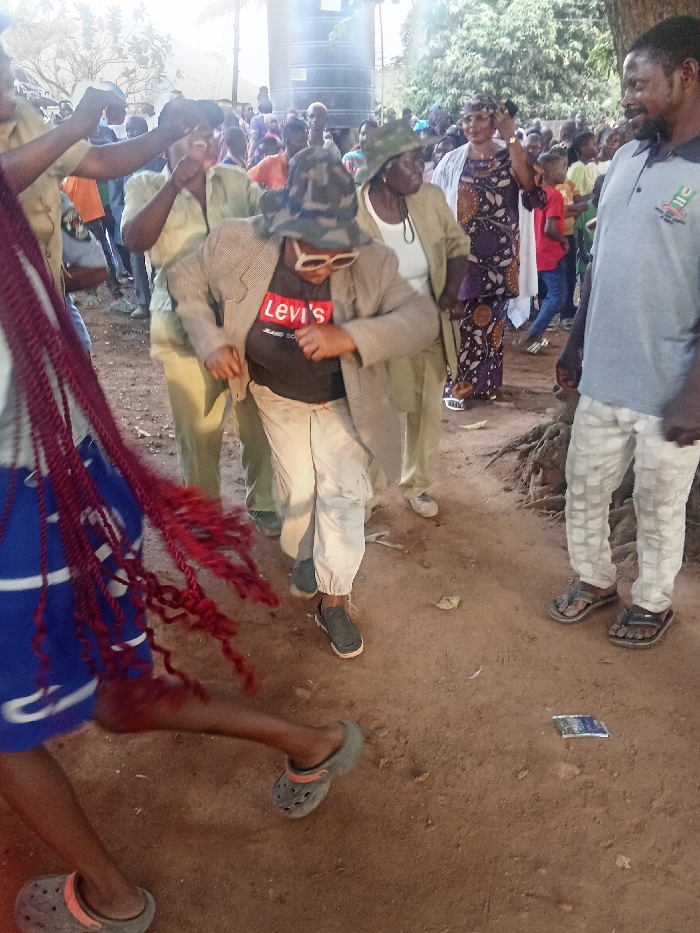 A crowded outdoor event features a diverse group of people dancing. In the foreground, a person with red braids wears a blue skirt and gray Crocs. Central figures include an individual in a tan blazer, camouflage hat, and white sunglasses dancing energetically, along with others dressed in olive green outfits. A man in a gray shirt stands near tree roots. The ground is reddish-brown soil. A large silver tank is visible in the background.
