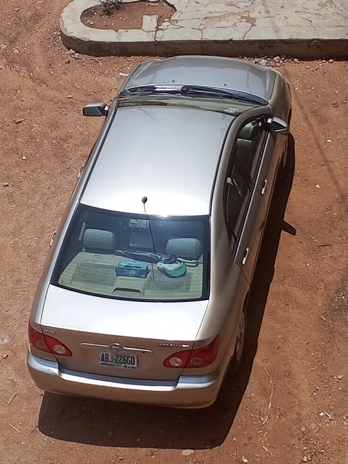 A light gold Toyota Corolla sedan with Nigerian license plate ABJ-226GD is parked on reddish-brown dirt in Oko Erin, Nigeria