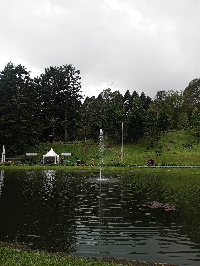 A serene lake scene under a cloudy sky. Tall evergreen trees line the far shore, with a grassy hillside sloping down to meet the water's edge. A fountain sprays water high in the center of the lake. Structures, possibly picnic shelters or tents, are visible along the shoreline. People are walking along the path and even seated on the grass, adding life to the landscape. Ripples disturb the water's surface, reflecting the subdued light.