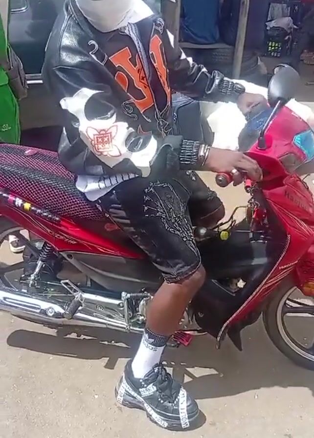 A person is sitting on a red motorcycle. They are wearing a black and white leather jacket, black jean shorts, white socks, and black platform sneakers. They also have on a white face covering and green goggles. The motorcycle is parked on a paved surface. In the background, there are other people and vehicles. The area appears to be an outdoor market or gathering place. The camera moves slightly.