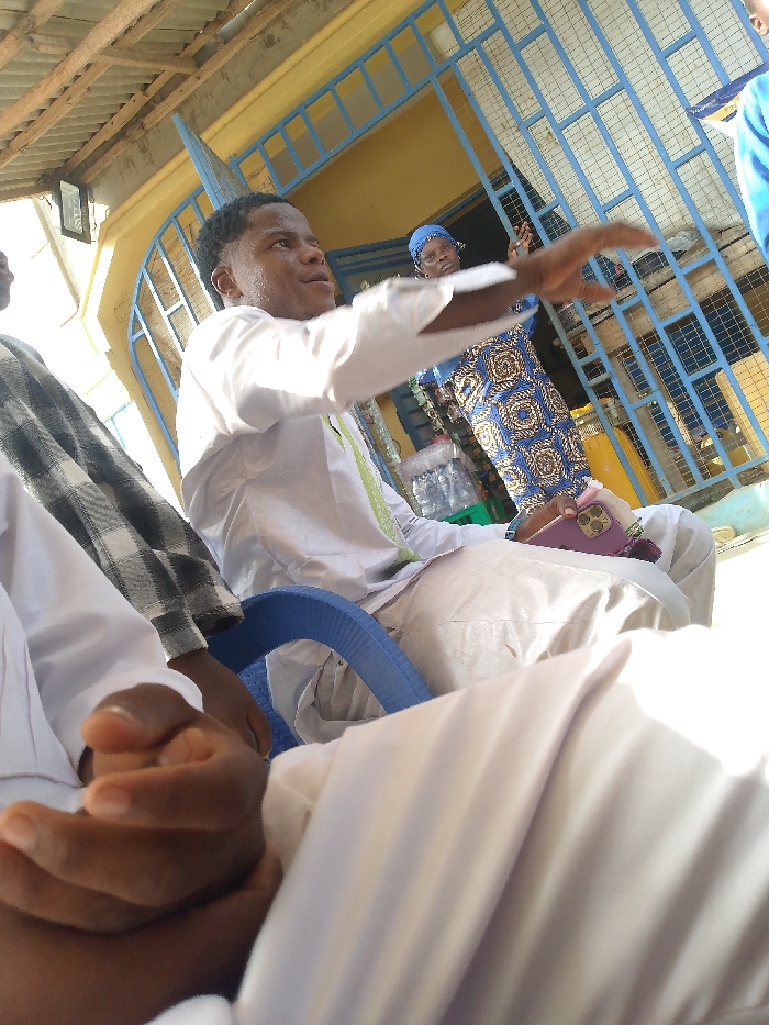 A man seated, gesturing with his right hand, wears a white garment with lime green trim. He sits on a blue chair, phone in lap. A woman stands behind him, wearing a blue and brown patterned dress and a blue headscarf. Another man, partially visible, wears a white garment with a gray and black plaid shawl. A blue metal gate is behind them. Bottles of water are visible in the background. The perspective is angled upward.